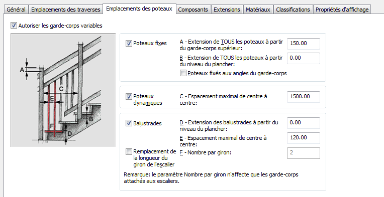 | définir les propriétés des poteaux (poteaux fixes, poteaux dynamiques et balustrades) lors de l'ajout ou de la modification des garde-corps | activez l'option Autoriser les garde-corps variables. |