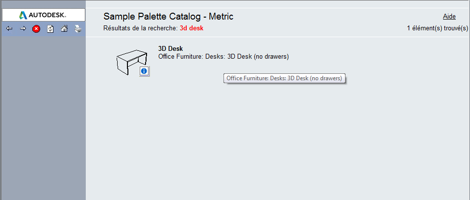 La fonctionnalité de recherche vous aide à localiser un outil spécifique. Vous pouvez effectuer une recherche dans plusieurs catalogues simultanément ou vous pouvez effectuer une recherche dans un catalogue, une palette ou un ensemble d'outils particulier. Par exemple, si vous recherchez un outil pour créer un bureau en 3D, vous pouvez lancer la recherche sur le mot-clé bureau 3D. La recherche s'effectue dans tous les catalogues actuellement affichés (ou filtrés). Vous pouvez préciser la recherche en filtrant l'affichage des catalogues.