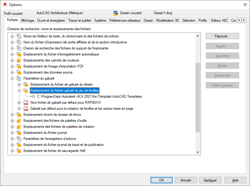 Configuration de l'emplacement du fichier de gabarit dans la boîte de dialogue Options