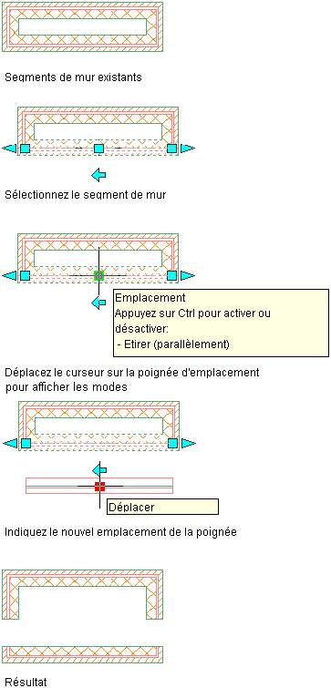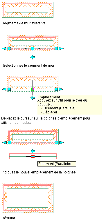 L'illustration suivante décrit l'utilisation de la poignée d'emplacement en mode Etirer (parallèlement) pour déplacer un segment de mur relié et parallèle aux autres tout en conservant les liaisons avec les murs adjacents.