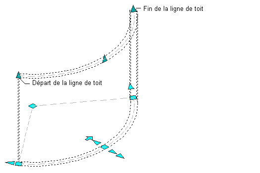 L'illustration suivante représente les poignées (Départ de la ligne de toit, Fin de la ligne de toit) qui s'affichent dans les vues 2D et 3D pour un segment de mur courbé.