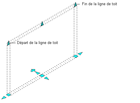 L'illustration suivante représente les poignées (Départ de la ligne de toit, Fin de la ligne de toit) qui s'affichent dans les vues 2D et 3D pour un segment de mur droit.