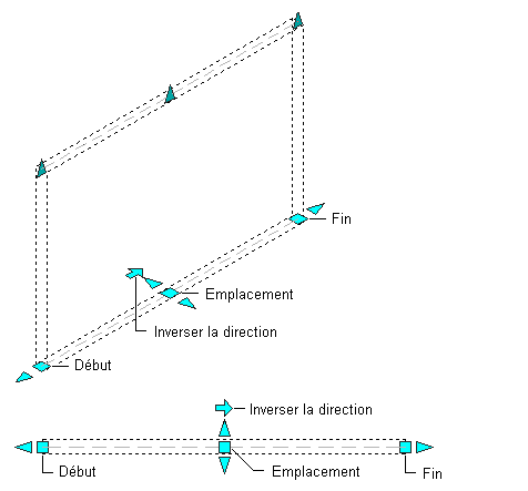 L'illustration suivante représente les poignées (Départ et Fin, Inverser la direction et Emplacement) qui s'affichent dans les vues 2D et 3D pour un segment de mur droit.