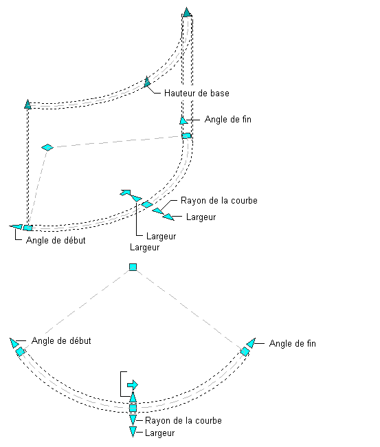 L'illustration suivante représente les poignées (Angle de début, Angle de fin, Largeur, Rayon de la courbe et Hauteur de base) qui s'affichent dans les vues 2D et 3D pour un segment de mur courbé.