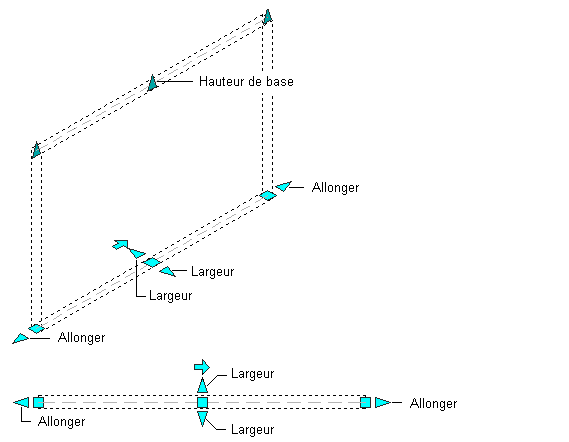 L'illustration suivante représente les poignées (Allonger, Largeur et Hauteur de base) qui s'affichent dans les vues 2D et 3D pour un segment de mur droit.