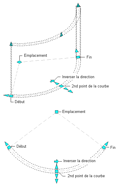 L'illustration suivante représente les poignées (Départ et Fin, Inverser la direction, 2ème point de courbe et Emplacement) qui s'affichent dans les vues 2D et 3D pour un segment de mur courbé.