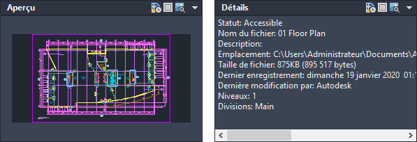 (Détails). Le premier volet fournit un aperçu du fichier de dessin sélectionné et le second une description détaillée.