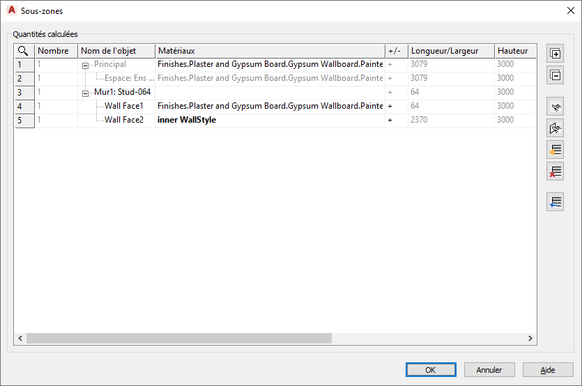 La boîte de dialogue Sous-zones répertorie toutes les zones subordonnées calculées pour l'objet principal. Des sous-zones telles que les ouvertures (fenêtres ou portes) dans les murs sont automatiquement détectées par le système et calculées suivant les règles définies dans les paramètres de calcul. Vous pouvez définir manuellement (ajouter ou soustraire) des sous-zones.