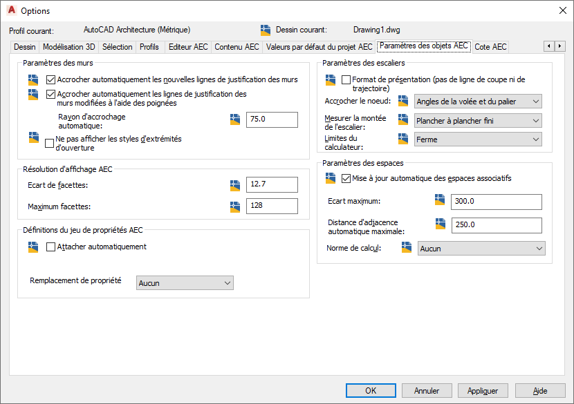 - Cliquez sur l'onglet Paramètres des objets AEC.