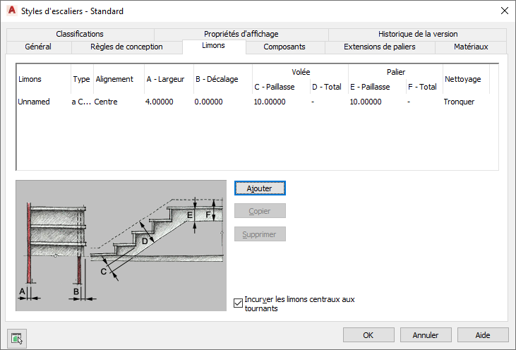 Limons centraux incurvés et à onglet au niveau des tournants de palier