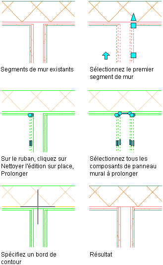 Cette procédure permet de modifier une intersection de mur en prolongeant un composant. Le contour de prolongement peut être une ligne, un arc, un cercle, une polyligne ou le bord d'un composant de mur.