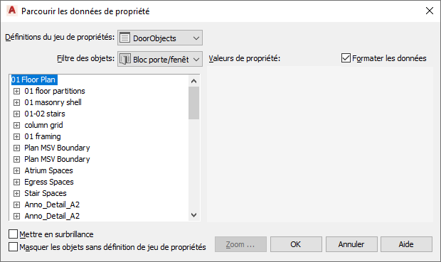 | associer un jeu de propriétés du dessin hôte à un objet dans une référence externe | Si aucune définition de jeu de propriétés portant le même nom n'a été associée à l'objet, les cases qui se trouvent juste en face sont vides. Cochez la case. Un jeu de propriétés est directement associé à l'objet. Il apparaît sur la droite et peut être modifié. |