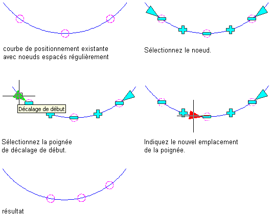Modification de l'emplacement du noeud de décalage de début d'une courbe de positionnement à l'aide de poignées