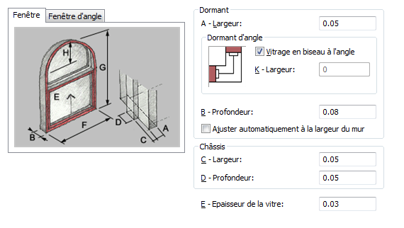 | modifier la largeur et la profondeur du dormant | sous Dormant, entrez des valeurs pour la largeur et la profondeur. |