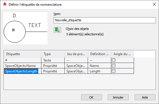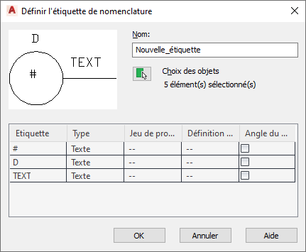 Cette procédure permet de créer une étiquette de nomenclature capturant et affichant les données de jeux de propriétés pour un objet spécifique du dessin.