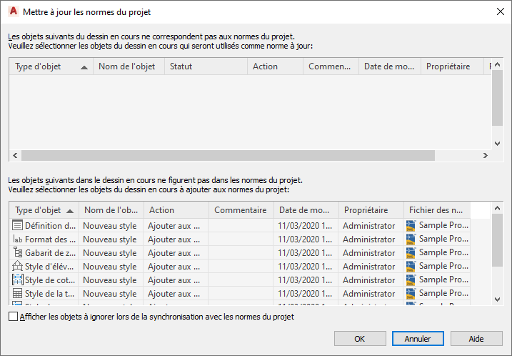 L'objet en question ne sera plus pris en compte lors des prochaines synchronisations, sauf si vous cochez la case Afficher les objets à ignorer lors de la synchronisation avec les normes du projet ou supprimez l'indicateur Ignorer du style ou du paramètre d'affichage dans le Gestionnaire des styles ou dans le Gestionnaire d'affichage.