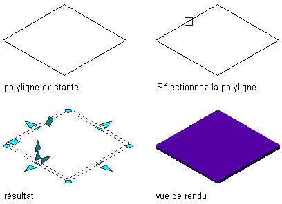 Cette procédure permet de convertir une polyligne fermée en dalle ou dalle de toit dont les propriétés sont identiques à celles de l'outil sélectionné. Ces propriétés peuvent être modifiées après la création de l'objet. La première ligne tracée de la polyligne devient le bord de ligne de base de la dalle ou de la dalle de toit.