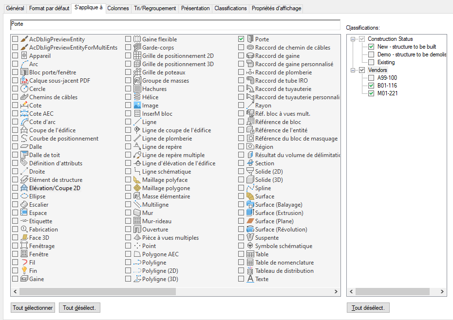 Si, par exemple, vous souhaitez répertorier dans une nomenclature uniquement les portes dont la classification de construction indique Nouveau et pour lesquelles un fournisseur préféré a été spécifié, vous pouvez préciser ces critères dans le style de table de nomenclature. Seules les portes répondant à ces deux critères peuvent être incluses dans la table de nomenclature.