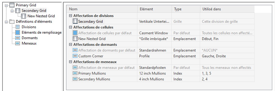 Cette procédure permet de créer une grille imbriquée dans une unité de mur-rideau. Une grille imbriquée est une grille qui se trouve au sein d'une autre. Chaque grille imbriquée est dotée de ses propres divisions, affectations de cellule, dormants et meneaux. Par défaut, le dormant est désactivé pour les grilles imbriquées.