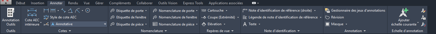 L'onglet Annoter contient des commandes permettant de marquer les fichiers de dessin.