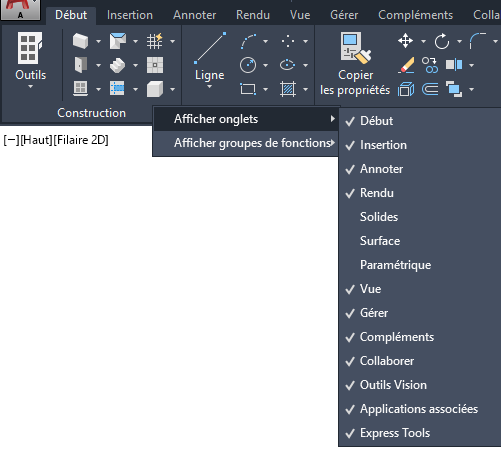 Une coche s'affiche en regard du nom de l'onglet ou du groupe de fonctions sélectionné.