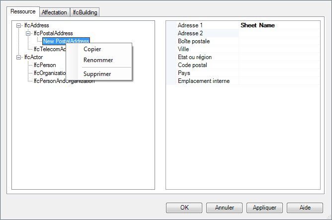 Dans l'onglet Ressource de la boîte de dialogue Ressource IFCX et affectation, sélectionnez la ressource IFC à modifier.