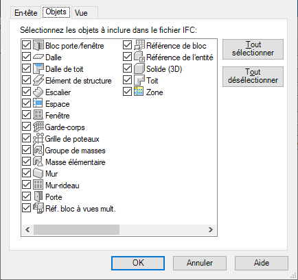 - Cliquez sur l'onglet Objets et sélectionnez les objets à inclure dans le fichier IFC.