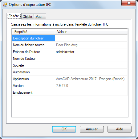 Le nom du dessin actif s'affiche dans l'onglet En-tête de la boîte de dialogue Options d'exportation IFC. Vous pouvez ajouter des informations sur le fichier de dessin à exporter : une description du dessin, le nom de son auteur et de la société, la date d'autorisation et l'emplacement géographique de l'édifice. Par exemple, si vous saisissez la description "Structure de bâtiment commercial 152" dans l'onglet En-tête, ces informations figurent alors dans l'en-tête du fichier IFC lorsque celui-ci s'affiche.