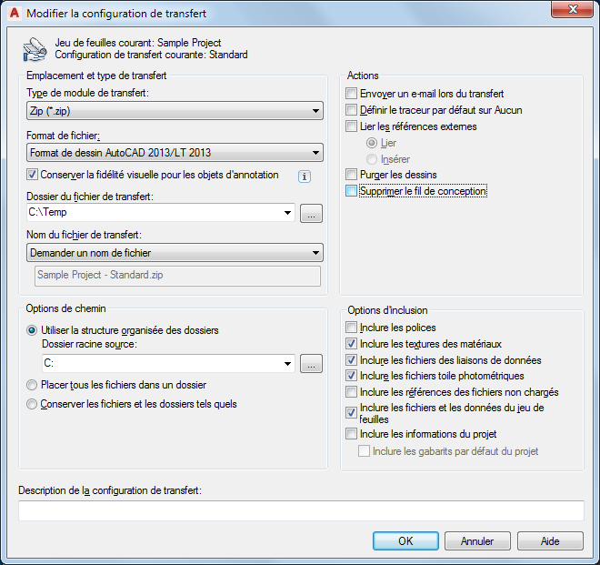 Si, par exemple, vous avez sélectionné ZIP comme type d'ensemble de transmission et C:\MyTransfer comme dossier de transmission, le fichier ZIP contenant votre projet se trouvera sous C:\MyTransfer\MyProject.zip.