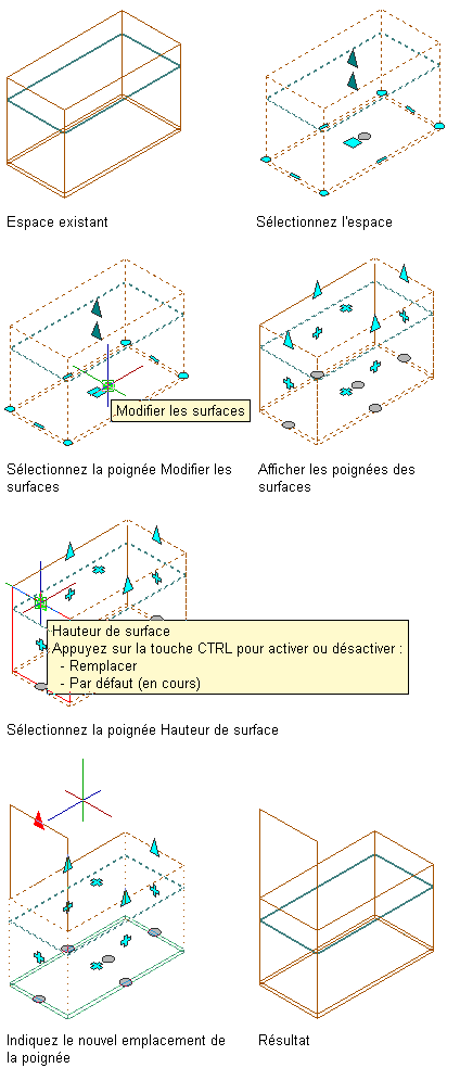 Cette procédure permet de modifier, à l'aide des poignées, la hauteur d'une surface d'un espace 3D extrudé.