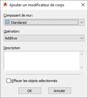 Vous pouvez créer un modificateur de corps à partir d'une masse élémentaire, d'un groupe de masses ou de tout autre objet AEC doté d'une masse. Il est également possible de créer des modificateurs de corps à partir de solides ACIS ou de blocs formant des corps 3D. Vous devez placer l'objet à l'emplacement de votre choix sur le dessin avant de définir l'objet comme modificateur de corps.