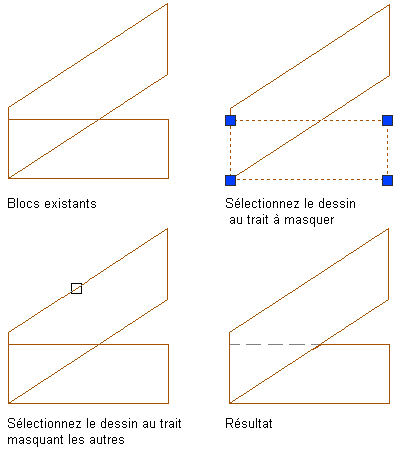 Cette procédure permet de masquer la zone d'un dessin au trait par rapport à un autre dessin au trait. Cette fonctionnalité est particulièrement utile si vous souhaitez indiquer qu'une entité se prolonge derrière ou sous une autre entité que vous voulez afficher au premier plan. Le dessin au trait masqué est placé sur le calque spécifié par l'identificateur de calque HIDDEN. Une fois l'option Masquer activée, vous pouvez également spécifier les deux angles d'un rectangle à utiliser.