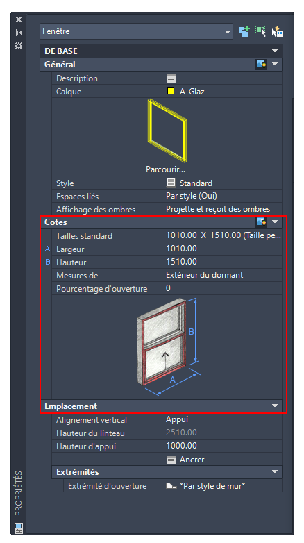 | au dormant intérieur | sélectionnez Intérieur du dormant dans la zone Mesures de. |