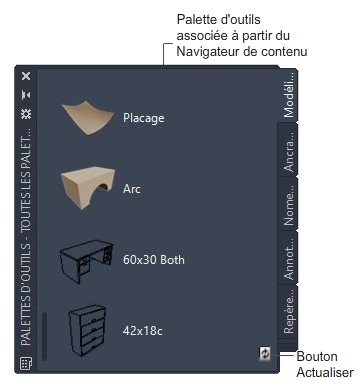 Lorsque vous liez une palette d'outils au jeu de palettes d'outils à partir d'un catalogue du Navigateur de contenu, un bouton d'actualisation apparaît au bas de la palette.