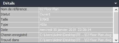 - Statut indique si la Xréf est chargée ou déchargée dans le dessin hôte, et affiche le dessin hôte comme Ouvert s'il est ouvert dans la fenêtre de dessin. Si le dessin hôte n'est pas ouvert dans la fenêtre de dessin, la valeur de statut est vide.