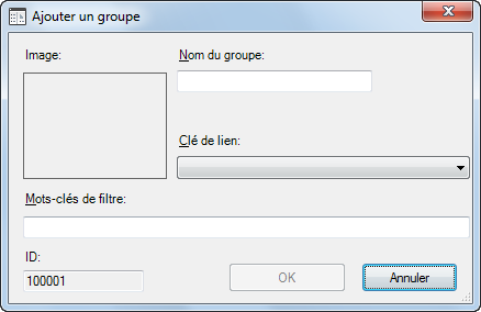 La boîte de dialogue Ajouter un groupe de composants s'affiche avec le champ d'ID en lecture seule indiquant la valeur affectée à ce groupe dans la table Groups de la base de données.