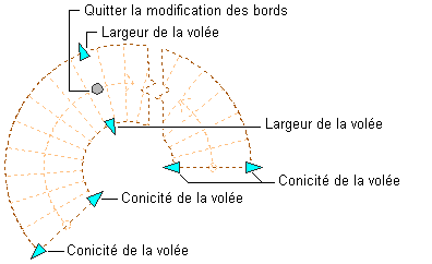 Poignées permettant de changer la conicité et la largeur de la volée d'un escalier en colimaçon et de quitter la modification des bords
