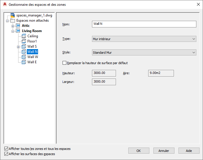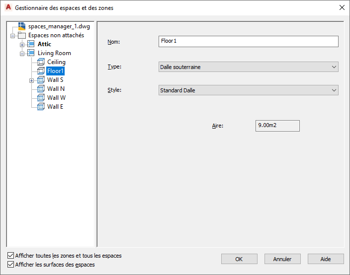 . Pour afficher tous les espaces dans le dessin, ainsi que leurs surfaces et les ouvertures de surface, vérifiez que les options Afficher toutes les zones et tous les espaces et Afficher les surfaces des espaces sont sélectionnées.