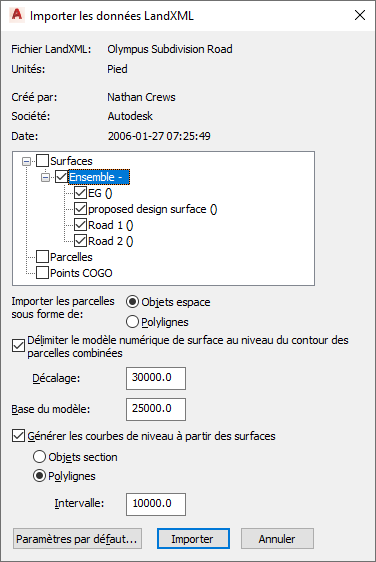 - Dans la boîte de dialogue Importer les données LandXML, sélectionnez les options d'importation.