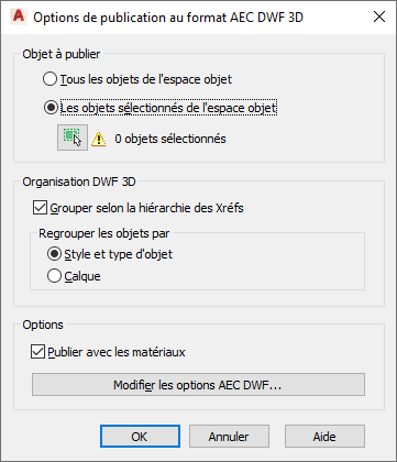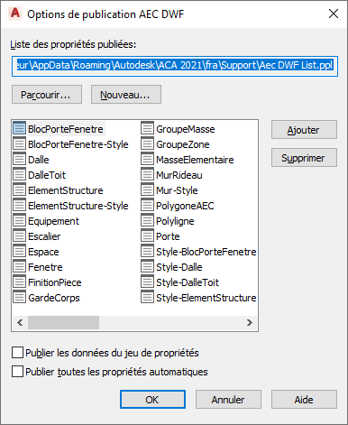 Cela génère la publication de toutes les propriétés automatiques associées aux objets sélectionnés pour l'exportation dans le fichier DWF ou DWFx.