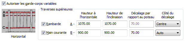 | définir les propriétés des rambardes et mains courantes (telles que la hauteur horizontale, la hauteur d'inclinaison et la distance de décalage) lors de l'ajout ou de la modification des garde-corps | activez l'option Autoriser les garde-corps variables. |