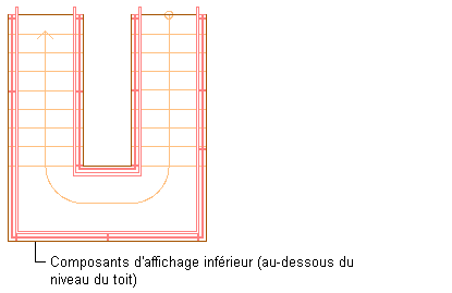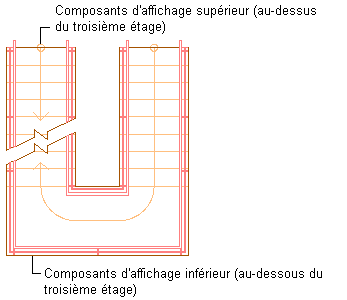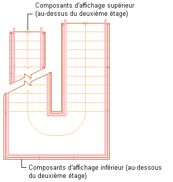 Il existe des composants qui permettent la prise en charge de la représentation des composants d'escalier au-dessus de l'élévation du plan de coupe. Ainsi, les composants d'escalier situés dans la partie inférieure sont utilisés uniquement pour afficher les composants d'escalier situés au-dessous du niveau en cours.