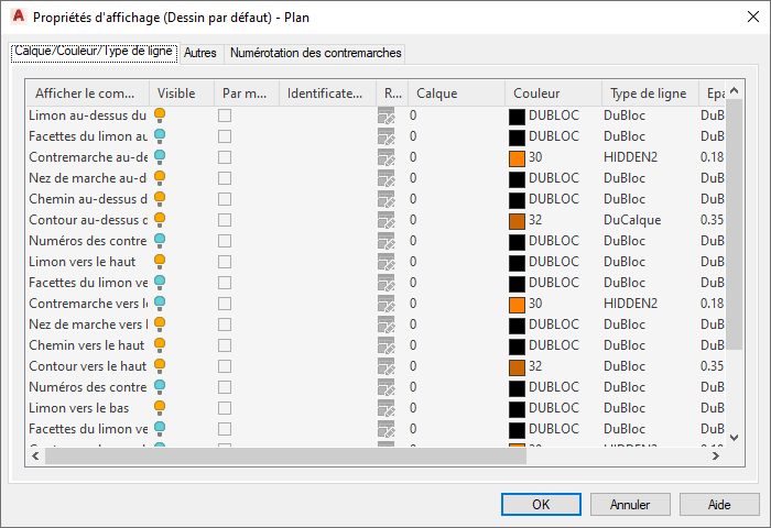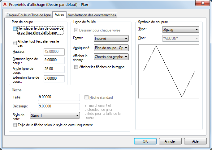 Pour les escaliers créés dans les versions d'Autodesk Architectural Desktop antérieures à 2004, l'option Remplacer le plan de coupe de la configuration d'affichage est sélectionnée par défaut. Dans la version actuelle, cette option est désactivée par défaut et l'affichage des composants d'escalier est géré automatiquement par des configurations d'affichage spécifiques à chaque niveau.