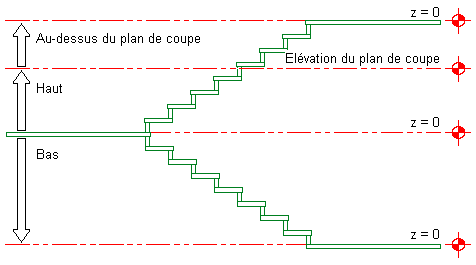 Cette procédure permet de spécifier l'affichage des composants d'escalier dans une vue en plan en fonction de leur occurrence au-dessus et au-dessous de l'élévation du plan de coupe. Pour chaque type de composant d'escalier, vous pouvez spécifier les propriétés des composants situés au-dessus et dans les parties supérieure et inférieure du plan de coupe.