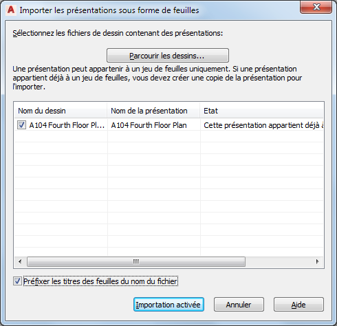 - Pour faire précéder le nom de la feuille du nom du fichier du dessin multi-feuilles, sélectionnez Préfixer les titres des feuilles du nom du fichier.