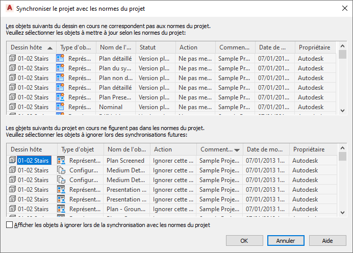 | Version en cours conforme | Le style ou le paramètre d'affichage dans le dessin de projet est identique à la version dans le dessin aux normes du projet. | Aucune action requise. L'objet est conforme à la norme. |