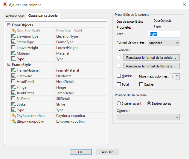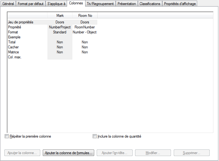 Chaque colonne contient les valeurs d'une propriété du jeu de propriétés. Les définitions de jeux de propriétés pour les propriétés que vous spécifiez doivent déjà exister dans le dessin pour que vous puissiez créer les colonnes correspondantes.