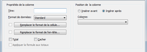 | spécifier un format et une orientation pour le titre de la colonne | cliquez sur Remplacer le format de l'en-tête et spécifiez les paramètres de format qui ne s'appliquent qu'aux cellules de données de cette colonne. |