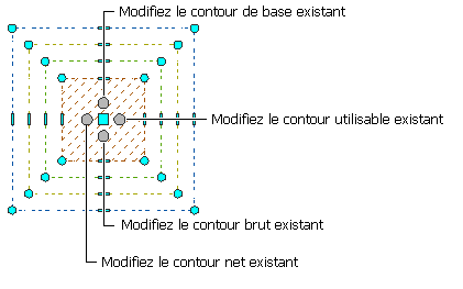 Une fois visibles, les contours net, utilisable et brut doivent être activés avant de pouvoir être modifiés à l'aide des poignées.