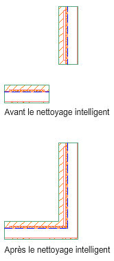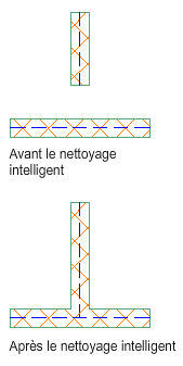 Utilisez la fonction de nettoyage intelligent pour nettoyer les intersections de murs. Les segments de mur non colinéaires sont ajustés ou étendus afin de générer des angles corrects. Sélectionnez les segments de mur et appliquez une méthode de nettoyage. En général, lorsque vous sélectionnez un contour, vous obtenez un nettoyage en T. Si aucun contour n'est sélectionnée, vous obtenez un nettoyage en L.